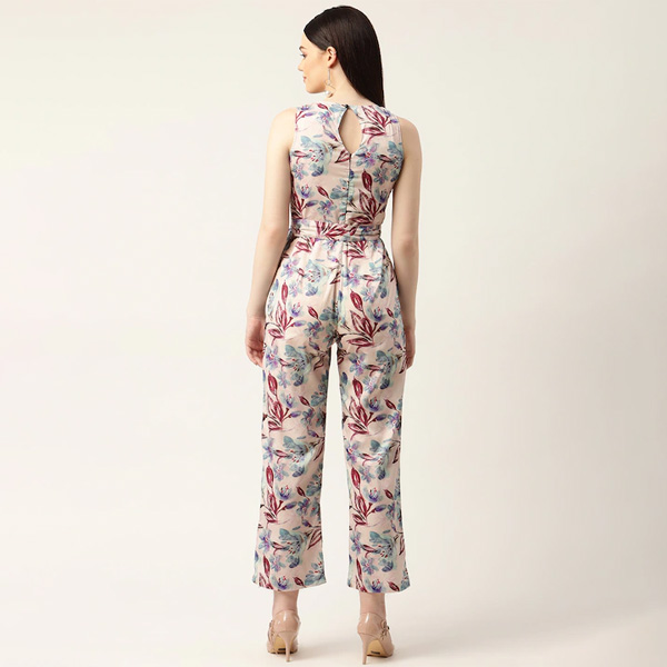 Beige and maroon printed culotte jumpsuit with waist tie-ups ,has a round neck, sleeveless, 2 pockets