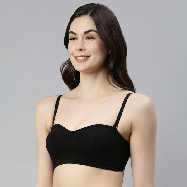 Black solid full-coverage Bandeau bra Non Padded and Non-Wired cut and sew cups Strapless straps and back closure, Back style: Regular, Feature: All Day Comfort. 1. This stylish strapless bra for women from Enamor comes with detachable transparent straps. This fun bra can be used in 7 different ways and is ideal for strapless dresses, strapless tops, off-shoulder dresses, off-shoulder tops, wide neck dresses, wide neck tops. 2. Engineered with Fab Comfy 5 this bra supports you with gentle support, soft hold straps, flexi-grip elastic and gives you perfect shape and coverage. 3. No slip promise in this ideal bra for women with soft silicon gripper elastic. Ideal coverage for comfort even when worn strapless. Double layer bra cups front for no-show coverage and Smooth shape under outer wear with no seams. 4. Bust support and lift with non-wired styling No unsightly seams showing through outer wear. 5. Stay comfortable all day with stretchable cotton fabric which is naturally breathable and absorbent.