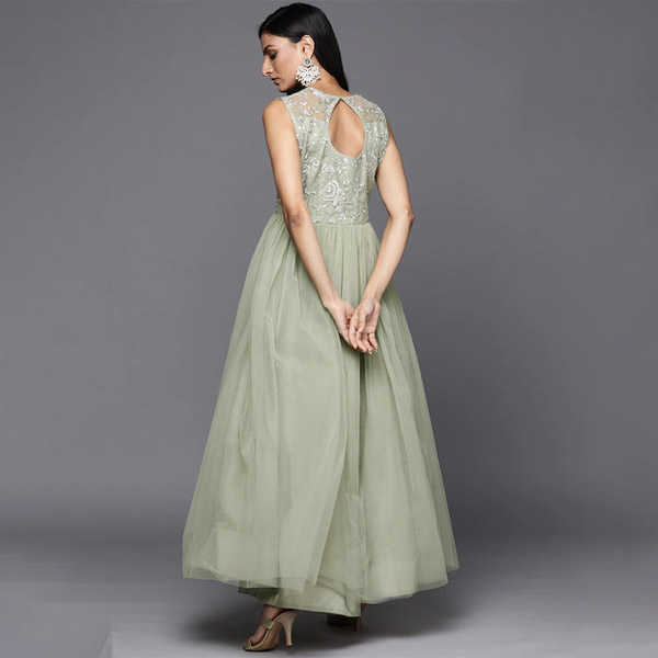 Green ethnic motifs embroidered gown dress Round neck Sleeveless Embroidered detail Maxi length in flared hem Net fabric Concealed zip closure.