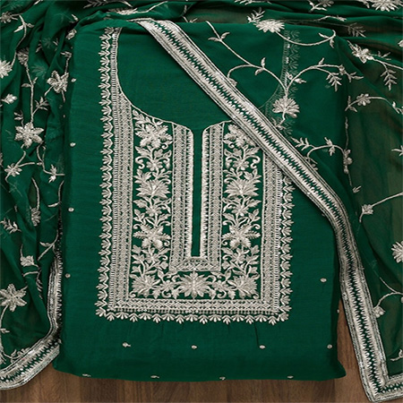 Green & Silver-Toned Embroidered Unstitched Dress Material