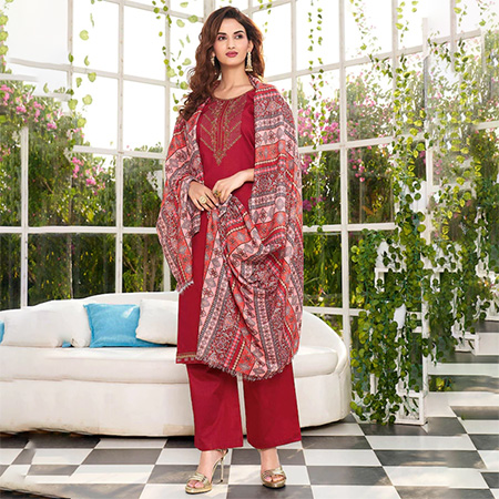 Maroon and pink embroidered unstitched dress material