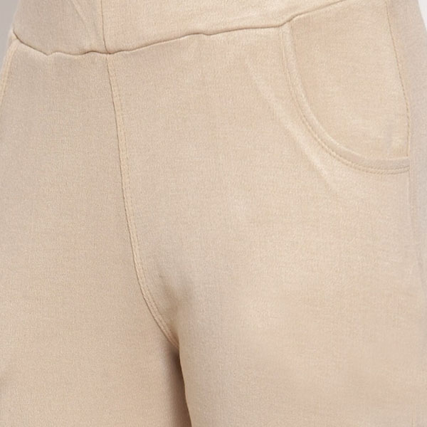 Pack two solid knitted mid-rise leggings pants in beige and black, each has two pockets, an elasticated waistband